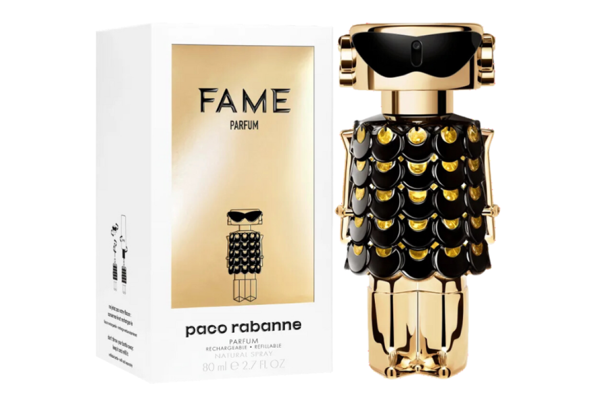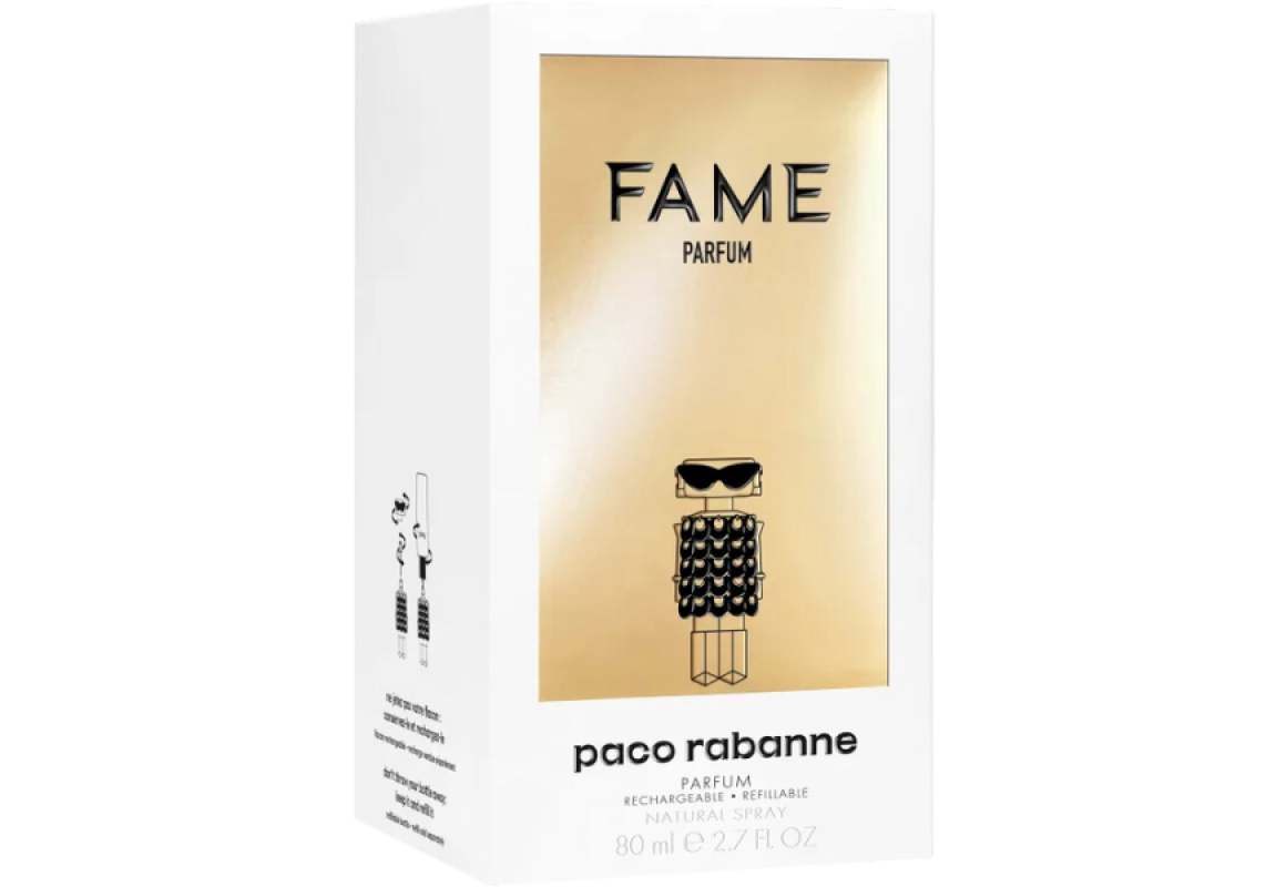 Fame Parfum da grife Rabanne, família olfativa floral frutado, perfume feminino francês lançado em 2023.