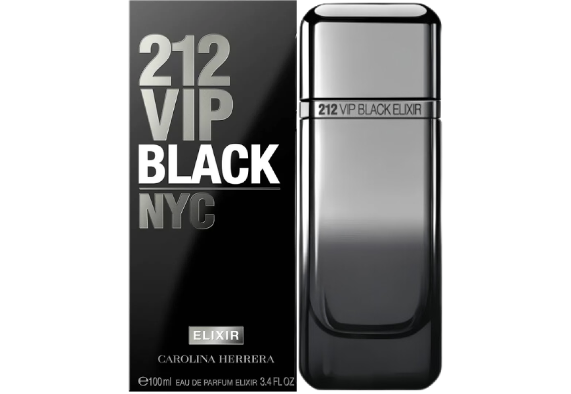 212 Vip Black Elixir Nyc Eau de Parfum da grife Carolina Herrera, família olfativa oriental fougère, perfume masculino espanhol lançado em 2025.